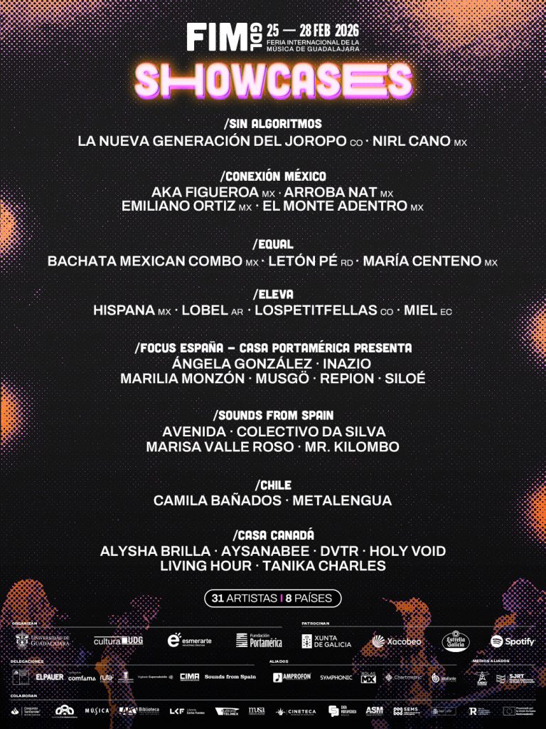 La FIM GDL anunció el programa oficial de showcases de su edición 2026, que se celebrará del 25 de febrero al 1 de marzo, y consolida a la feria como una de las plataformas clave para la circulación artística, el encuentro profesional y la proyección internacional de la música iberoamericana. En su onceava edición, FIM GDL reunirá proyectos provenientes de México, Argentina, Colombia, Ecuador, República Dominicana, España, Chile y Canadá, con un énfasis especial en España como país foco, además de la incorporación de nuevas ventanas internacionales respaldadas por instituciones clave de Chile y Canadá, lo que amplía el alcance estratégico y el perfil internacional de la feria.