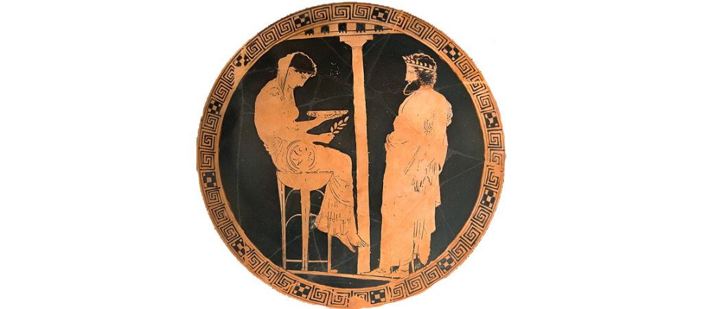 Nota 3: Imagen de Wikipedia. Oráculo de Delfos English: Attic red-figure kylix from Vulci (Italy), 440-430 BC. Kodros Painter. Oracle of Delphi: King Aigeus in front of the Pythia. Antikensammlung Berlin, Altes Museum, F 2538.